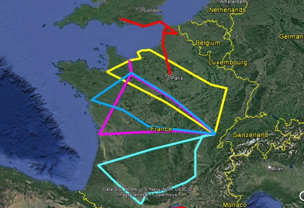 Mes voyages en ULM. En rouge le « Tour de France 2001 » avec traversée de la Manche