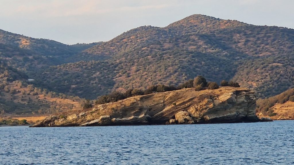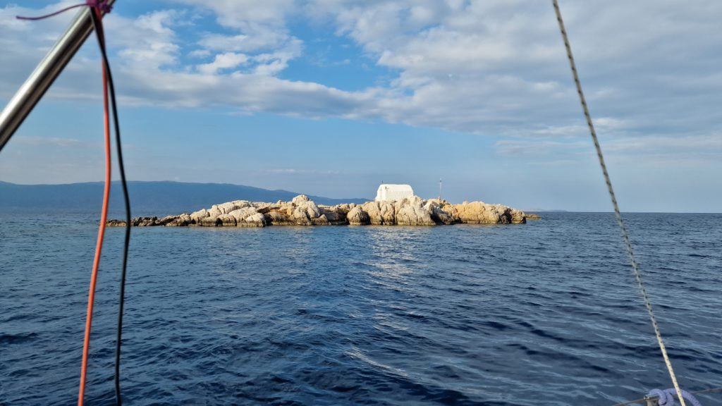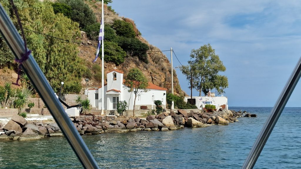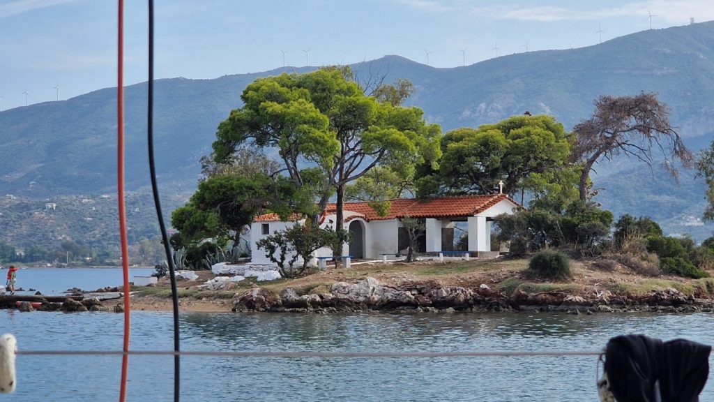 Une nuit dans la belle baie Shoebill Bayà coté de Vagionia Bay au nord de Poros en compagnie de guêpes puis je me déplace en face du Monastère de Zoodochos Pigi (la Source qui donne la vie) pour me proteger du Meltem annoncé