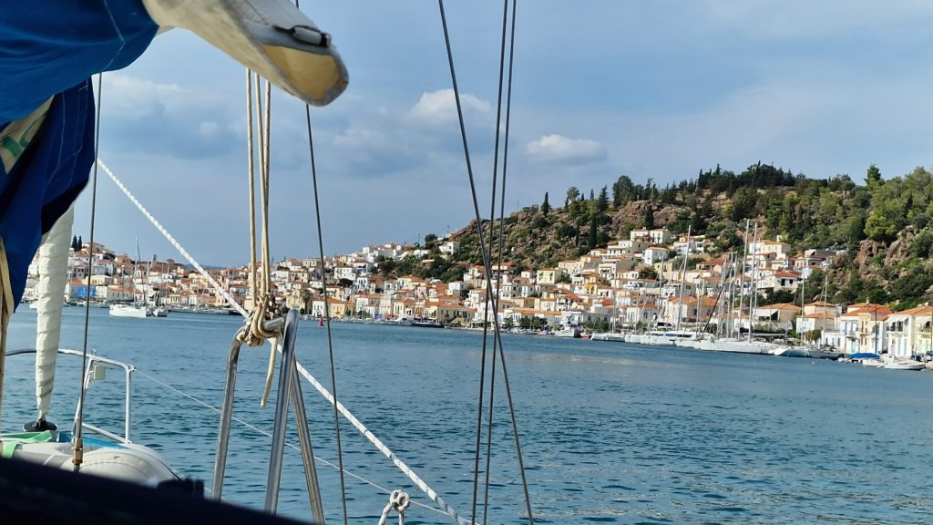 Apres une nuit à Dokos où on est arrivés de nuit retour à Poros et repas à l’Oasis à 14