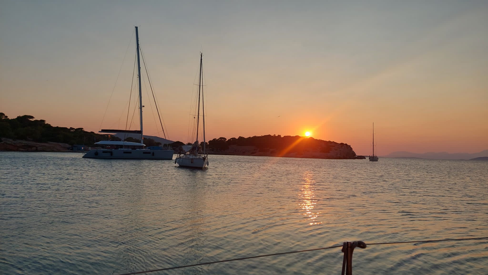 C’est une baie protégée, entourée de nature (pins, collines boisées), ce qui donne une ambiance très relaxante.